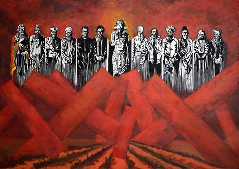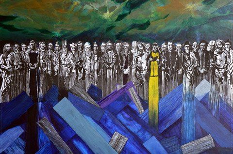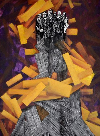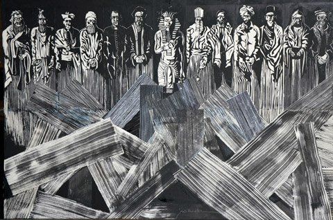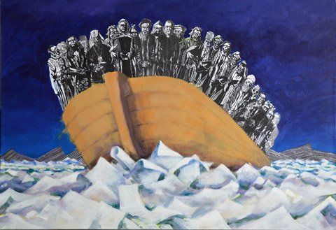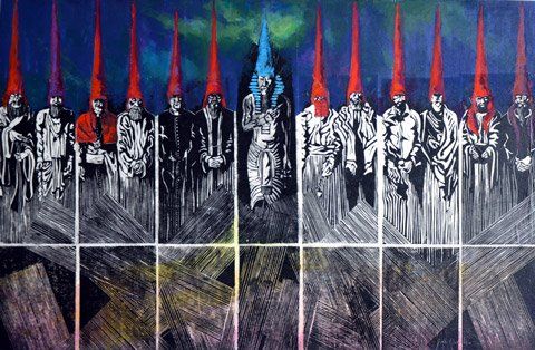 9 acrylschilderijen met linodruk ± 67 x 97 cm.
